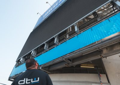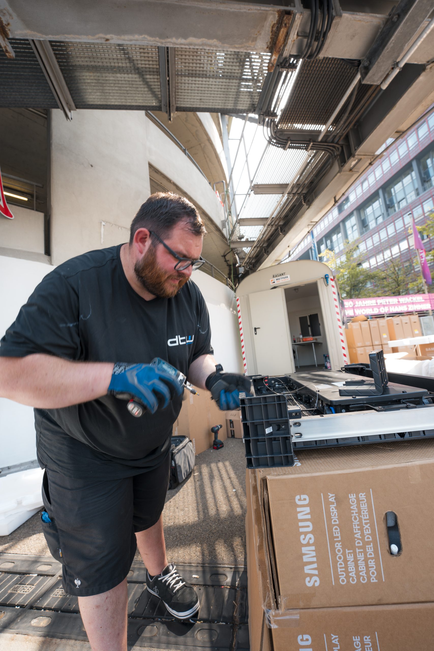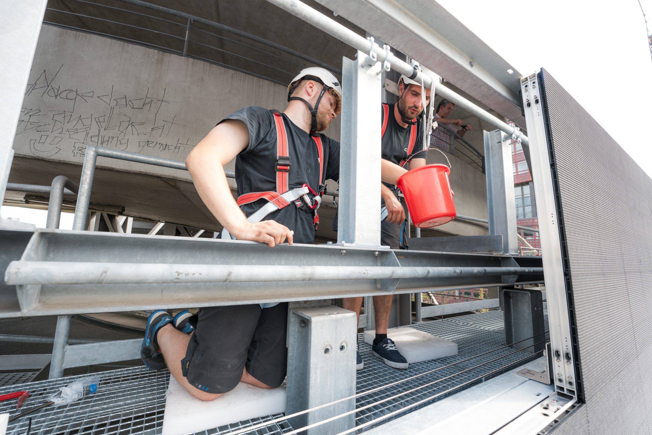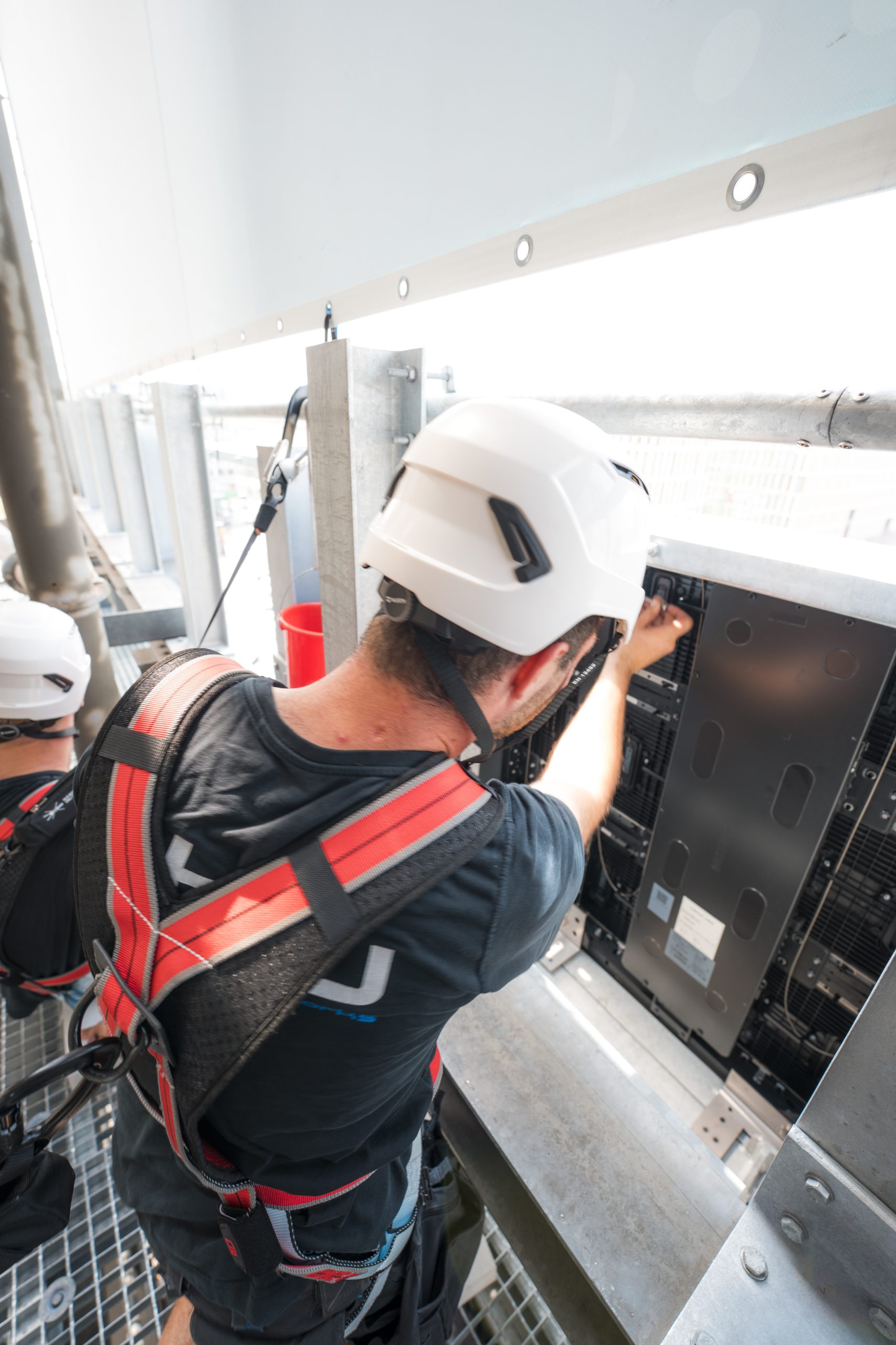 Insgesamt 152 LED-Module von Samsung (114 große mit 69×103 cm & 38 kleinere mit 69×69 cm) wurden von zwei Technikern und einem Obermonteur in über zwei Wochen Montagezeit Stück für Stück verbaut. Unter professioneller Höhensicherung entstand so eine ca. 100 m² große LED-Fläche, die täglich von über 223.000 Menschen gesehen wird.