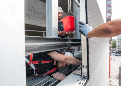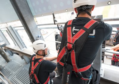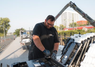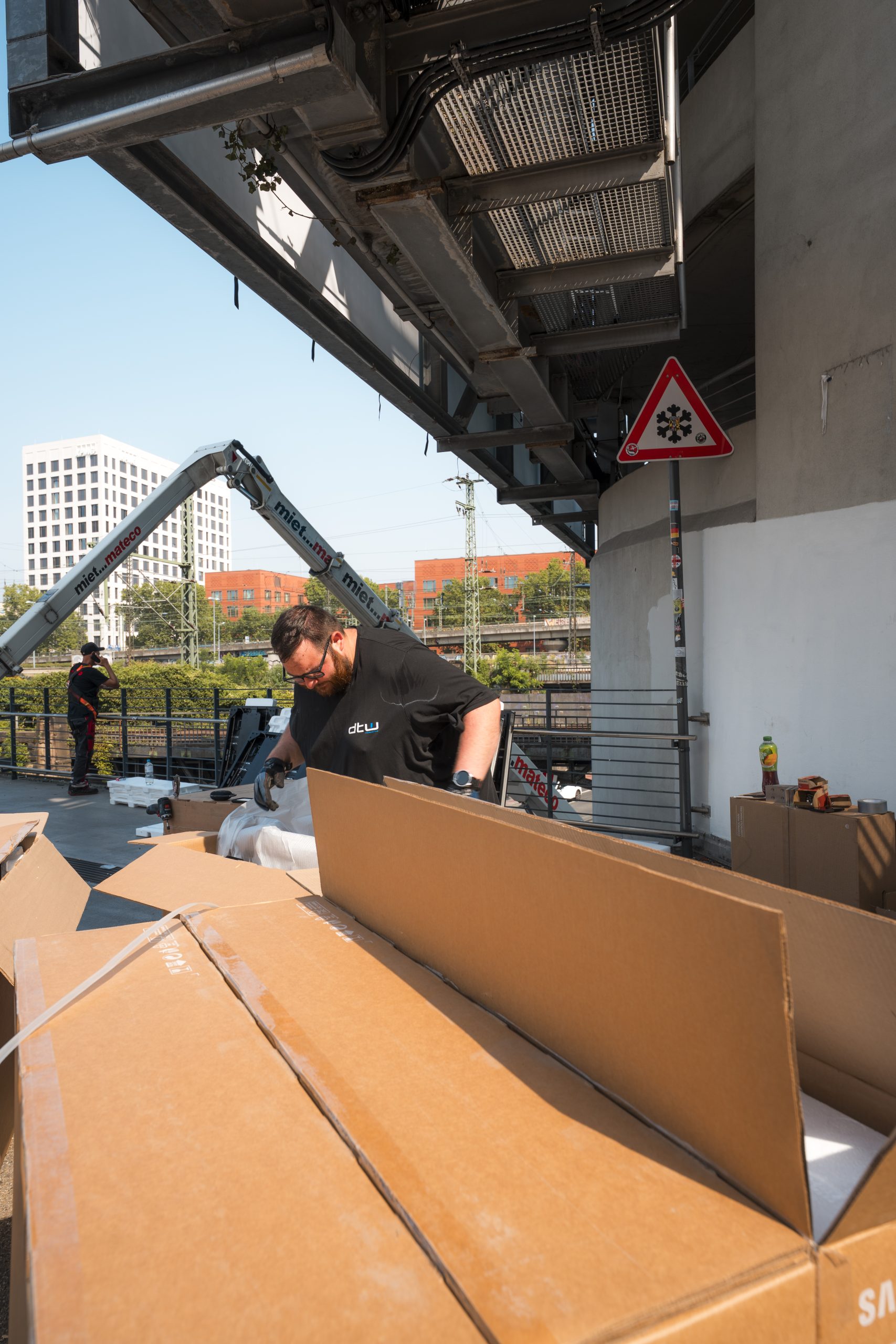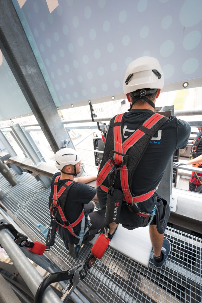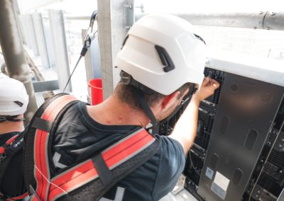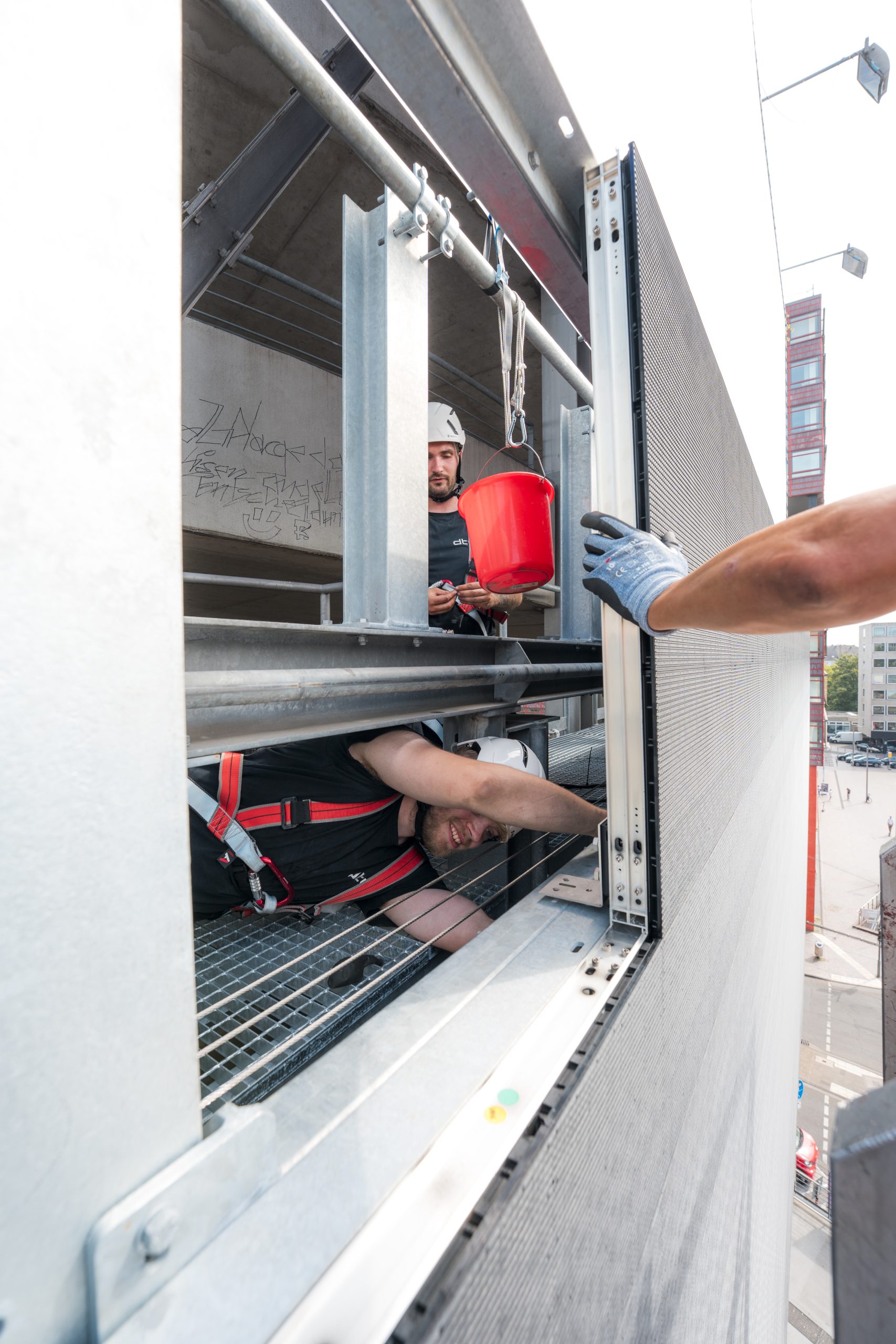 Insgesamt 152 LED-Module von Samsung (114 große mit 69×103 cm & 38 kleinere mit 69×69 cm) wurden von zwei Technikern und einem Obermonteur in über zwei Wochen Montagezeit Stück für Stück verbaut. Unter professioneller Höhensicherung entstand so eine ca. 100 m² große LED-Fläche, die täglich von über 223.000 Menschen gesehen wird.